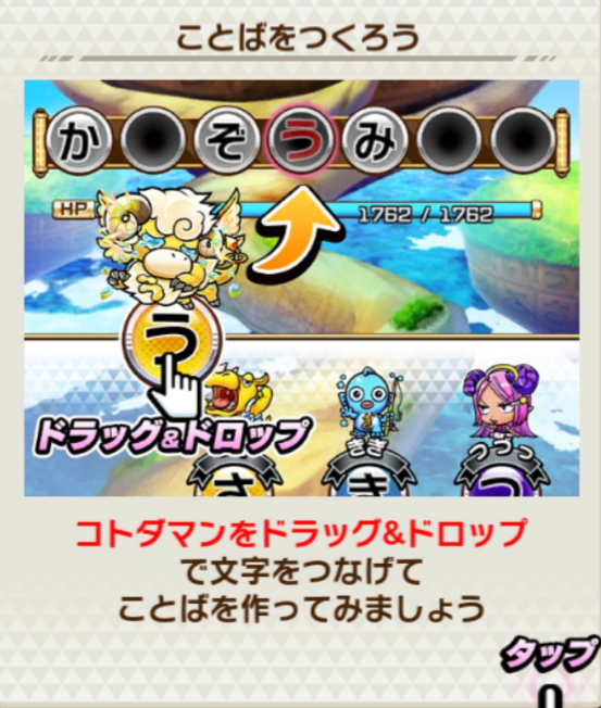 このゲームでは、文字の精霊である「コトダマン」たちが持つ文字を組み合わせてことばを作り、敵を攻撃します。